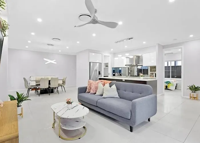Die Villa Brand New Single Story 5 Bedroom House In Marsden Park bietet eine Essecke mit Ausstattung zur Kaffee- & Teezubereitung. Gäste können auch eine Mikrowelle, eine Kaffee-/Teemaschine und einen Kühlschrank nutzen, um ihre eigene Mahlzeit zuzubereiten. Der Flughafen Sydney ist in 54 Minuten mit dem Auto zu erreichen.